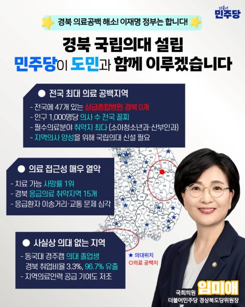 더불어민주당 경상북도당 위원장인 임미애 국회의원이 경북 지역의 숙원 사업인 ‘국립의과대학 설립’을 위해 대통령과 주무 부처 장관을 잇달아 만나는 광폭 행보를 펼치는 한편 도민과 함께하는 본격적인 홍보 캠페인에 돌입했다.