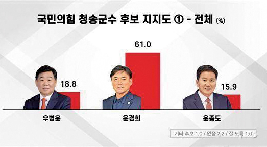 이같은 결과는 지난 26일, 뉴스1 코리아 대구경북취재본부와 에브리뉴스가 에브리리서치에 의뢰해 실시한 국민의힘 청송군수 후보 여론조사 결과 “국민의힘 경선에 3명의 후보자가 경선한다면 누구를 지지하겠는가”라는 물음에 대해 윤경희 예비후보가 61%를 기록했다. 이어 우병윤 예비후보 18.8%로, 42.2%의 격차를 보였으며, 윤종도 예비후보는 15.9%로, 45.1%의 격차를 보였다.
